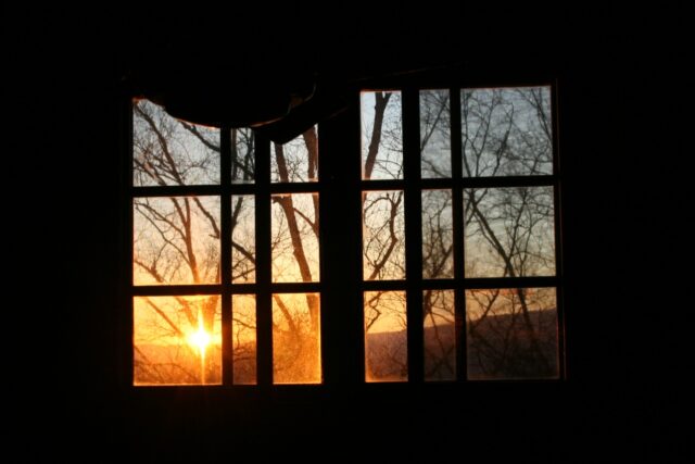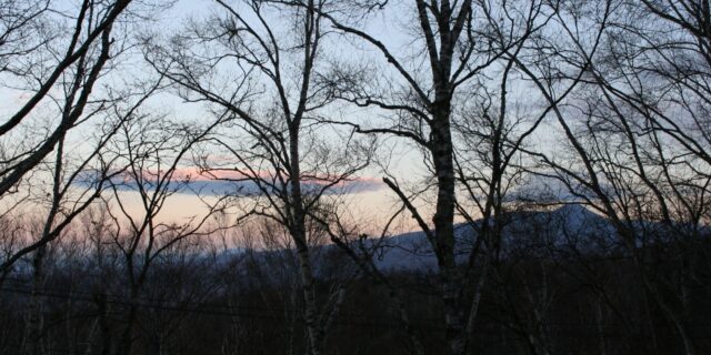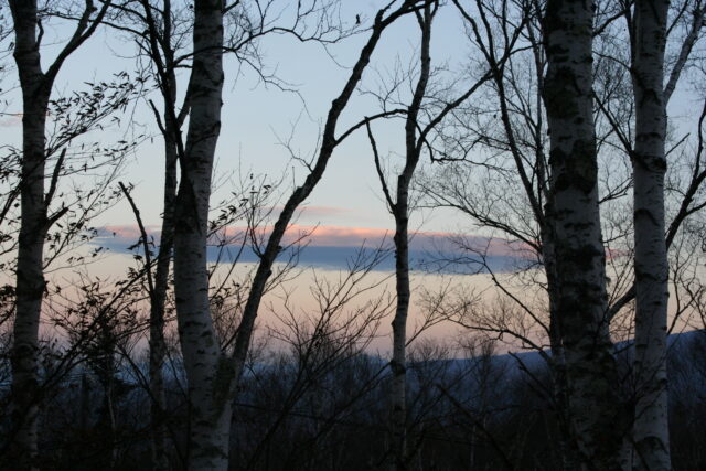 窓に目をやると山々の稜線の向こうの空が朝焼けで染まっている。